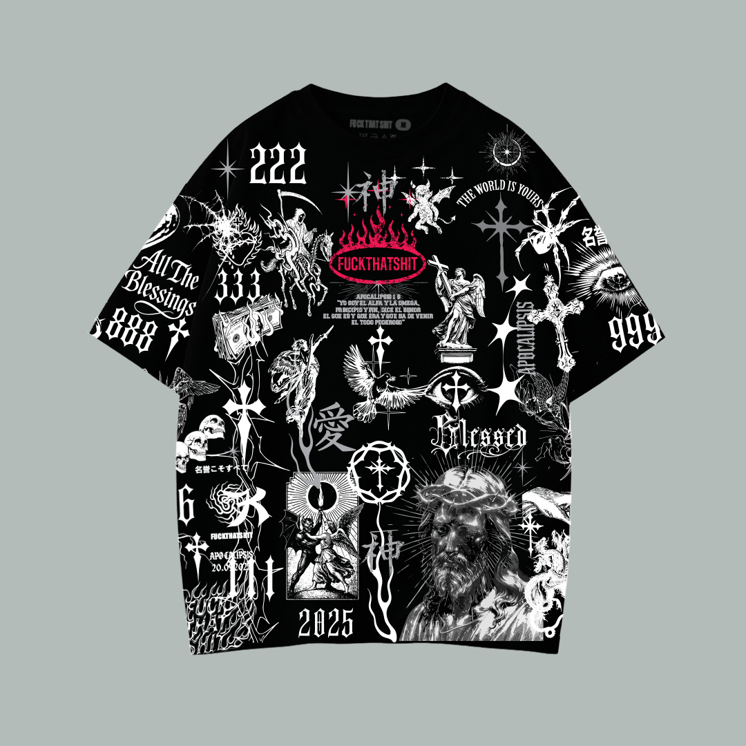 Un diseño que no se repite: saturado, profundo, cargado de símbolos de poder, bendiciones y mitología. Cada trazo cuenta una historia, pensado para quienes buscan más que ropa: buscan portar arte y significado.